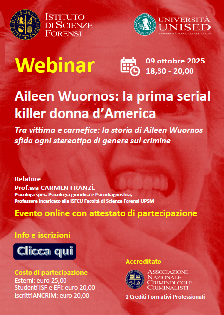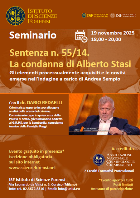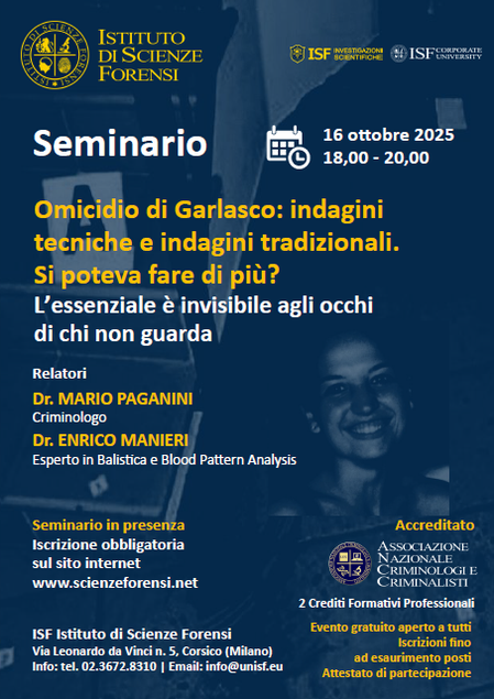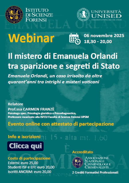 Seminario (in presenza) accreditato dall'Associazione Nazionale Criminologi e Criminalisti (n. 2 crediti formativi professionali). Evento gratuito aperto a tutti. Obbligatoria l'iscrizione.